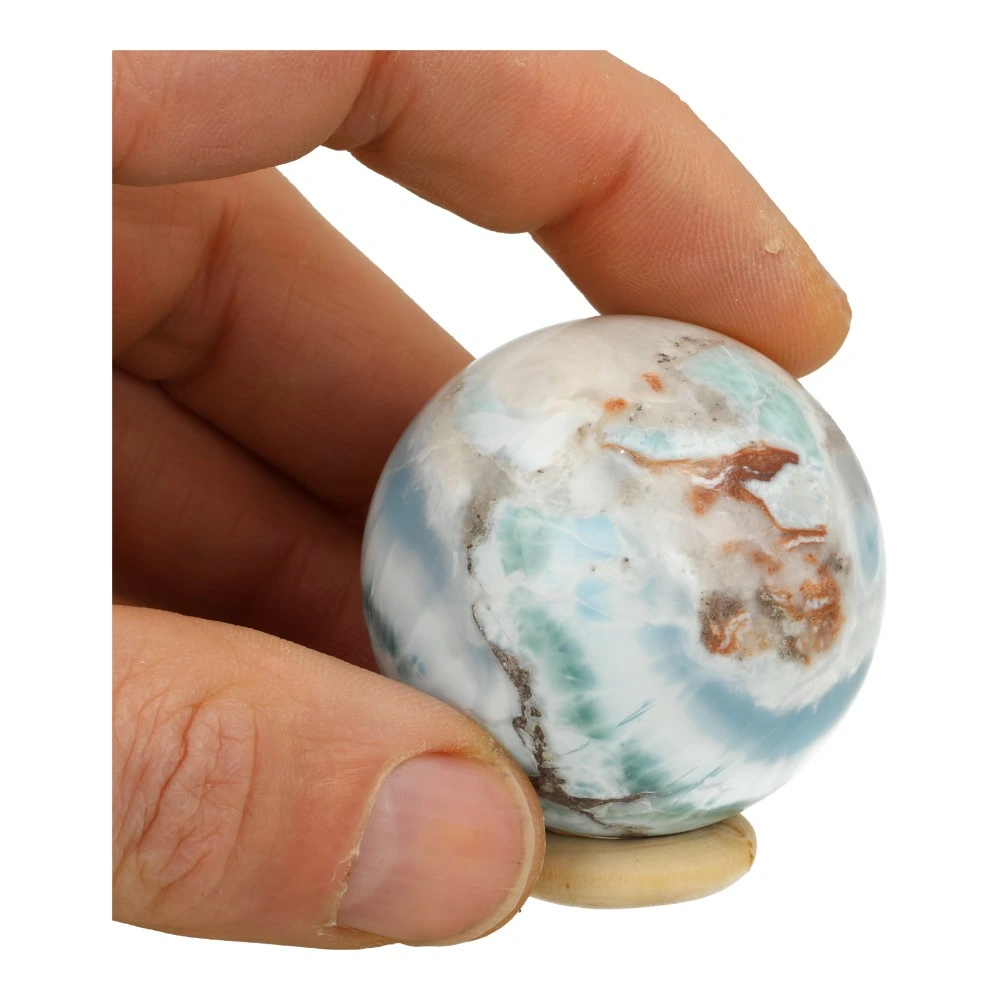 Fraaie larimar bol met diameter van circa 46mm ‘nr1’ op houten ring en met fraaie tekening. Je ontvangt uiteraard de larimar bol van de foto, een fraaie bol die rust, ruimte en verdieping biedt. De ‘nr1’ aanduiding is puur om de verschillende bollen met dezelfde diameter te identificeren en zegt niets over de kwaliteit. Deze larimar bol heeft een heldere energie en nodigt je uit om te spelen en je bewustzijn te verruimen. Een unieke bol van een zeldzaam mineraal.