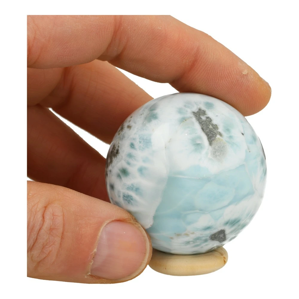 Fraaie larimar bol met diameter van circa 47mm op houten ring en met fraaie tekening. Je ontvangt uiteraard de larimar bol van de foto, een fraaie bol die helderheid, ruimte en verdieping biedt. Deze larimar bol heeft een verhelderende energie die het denken verruimt en je uitnodigt om je liefdevol uit te spreken. Ze geeft verdieping en nodigt je uit je bewustzijn te verruimen. Een unieke bol van een zeldzaam mineraal.