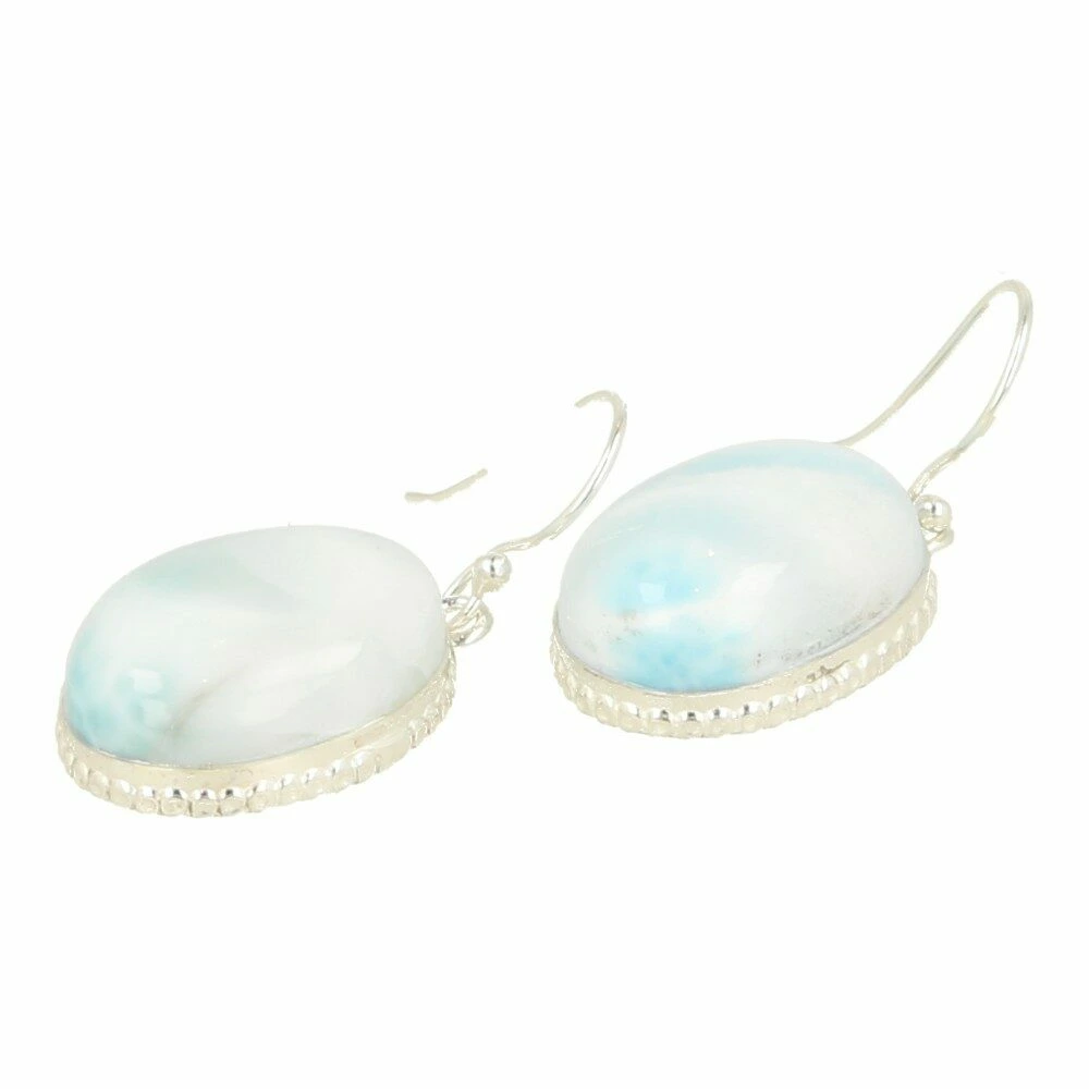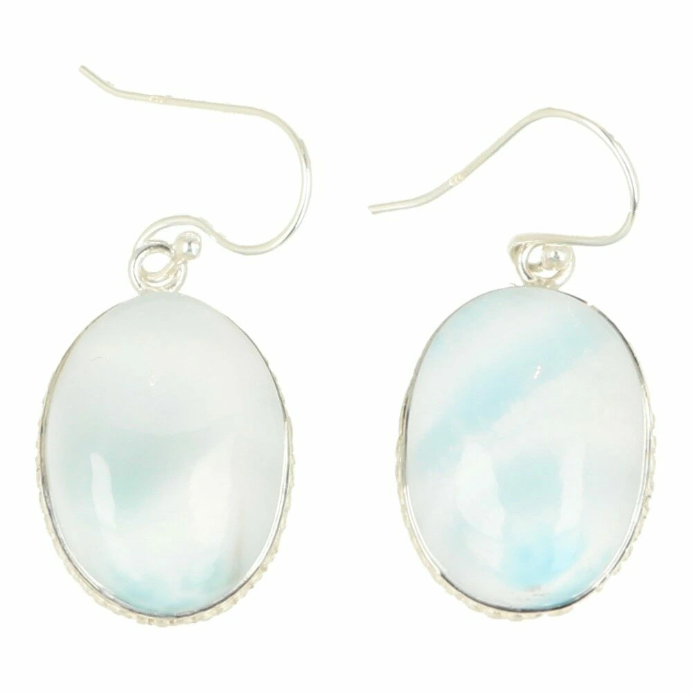 Mooie larimar oorbel in zilver groot in oorhanger uitvoering met larimar in bolgeslepen ovale vorm met sierlijk zilverwerk uit de Dominicaanse Republiek. De larimar oorbel is gemaakt van juwelierskwaliteit 925 sterling zilver. De afmeting van de larimar in de oorbel is ongeveer 20mm hoog en 15mm breed. Je ontvangt de larimar oorbellen van de foto.