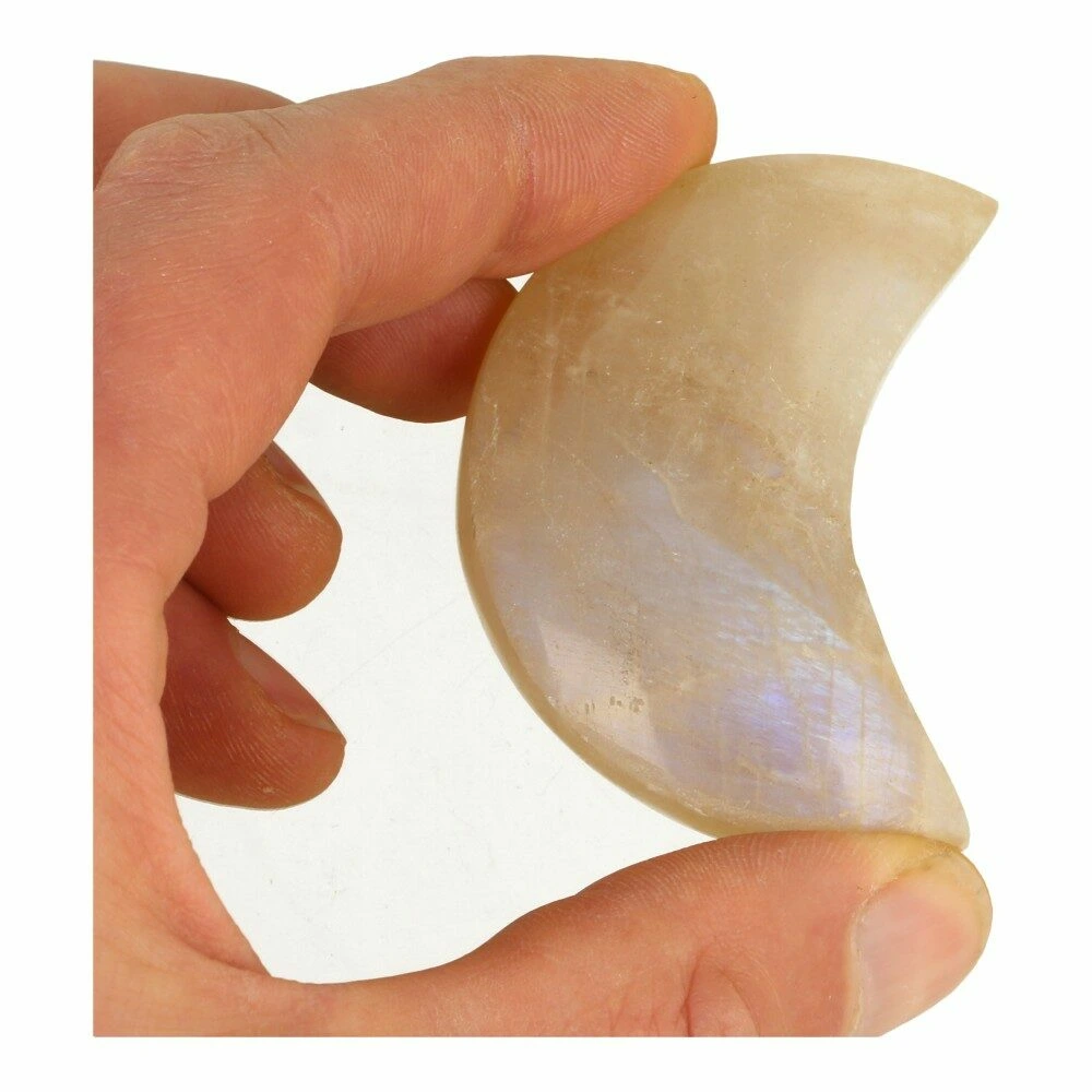 Mooie A-kwaliteit maansteen maan met fraaie blauwe glans uit Tanzania. Deze fraaie maansteen maan met blauwe glans is ongeveer 6cm hoog, 4,5-5,5cm breed en 1,2-2cm dik. Iedere maansteen maan heeft een blauwe glans bij de juiste lichtinval, super mooi! Je ontvangt een soortgelijke maansteen maan als op de foto.