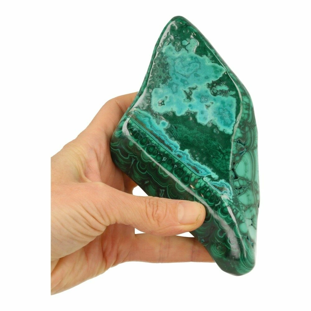 Prachtige diepgroene malachiet gepolijst uit Democratische Republiek Congo. Dit stuk gepolijste malachiet heeft een fraaie fijne tekening aan beide zijdes. Doordat de bolle groeivorm is gepolijst zijn de fraaie ronde lijnpatronen goed zichtbaar, en op de smalle zijde de laagjes waaruit de malachiet is opgebouwd. Dit stuk heeft een bijzondere lichte kleur groen en een achterzijde met een dun laagje chrysocolla en een bijzonder lijnenspel. De afmeting van dit fijne stuk malachiet is ruim 15cm lang, 9cm breed en 3,5cm hoog. Je ontvangt de malachiet gepolijst van de foto.