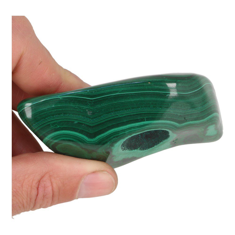 Prachtige diep-groene malachiet gepolijst uit Democratische Republiek Congo. Dit stuk gepolijste malachiet heeft een fraaie fijne tekening aan beide zijdes. Doordat de bolle groeivorm is gepolijst zijn de fraaie ronde lijnpatronen goed zichtbaar, en op de smalle zijnde de laagjes waaruit de malachiet is opgebouwd. Ook zit er een deel ongepolijste, donkergroene malachiet in de grote holte. De afmeting van dit massieve stuk malachiet is circa 100 x 62 x 29 mm. Je ontvangt de malachiet gepolijst van de foto.