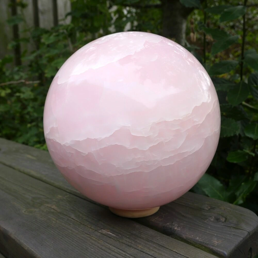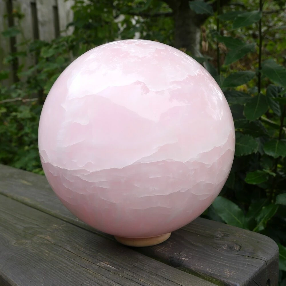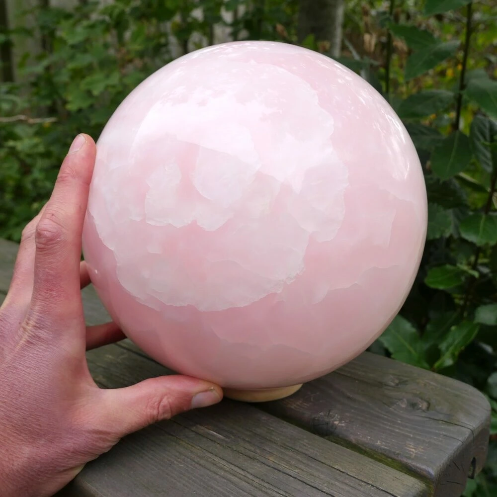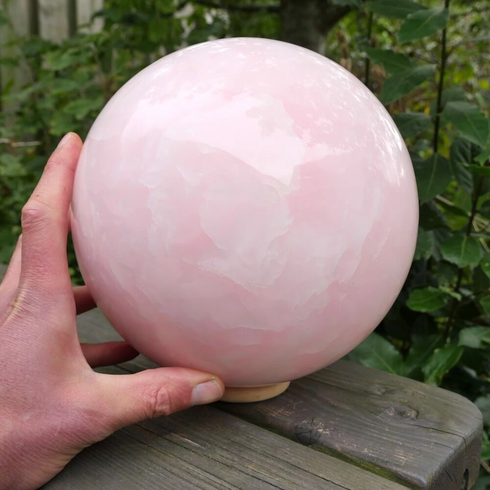 Heerlijk zachtroze mangano calciet bol XL met een diameter van maar liefst 21,6cm en een gewicht van meer dan 14kg! Mangano calciet wordt ook wel roze calciet of opaak genoemd. Deze bol heeft een hele heldere en zachte energie, een van de mooiste mangano calciet bollen die we ooit hebben gezien! Ze kan goed worden ingezet op een plek die met liefde gevuld mag worden, zoals bijvoorbeeld een woonkamer, praktijkruimte of groepsruimte. Een heerlijke bol die ook zeer geschikt is voor sensitieve mensen. De bol heeft een prachtige kleur, die bijna licht geeft. Daarnaast ook een subtiele lijnentekening, een echte beauty!