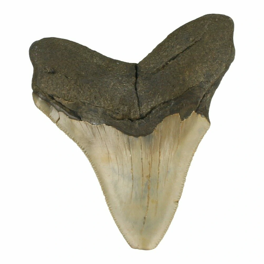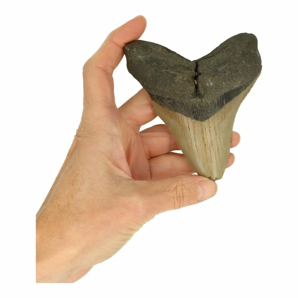 De kleur van een fossiele megalodon tand is afhankelijk van de grond waarin hij miljoenen jaren heeft gerust. Zo kunnen ze variëren van grijs, bruin en zwart tot zandkleurig of blauwgrijs. Elke tand is uniek — gevormd door tijd, water en aarde.
