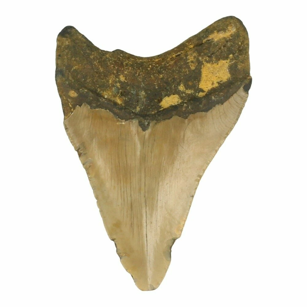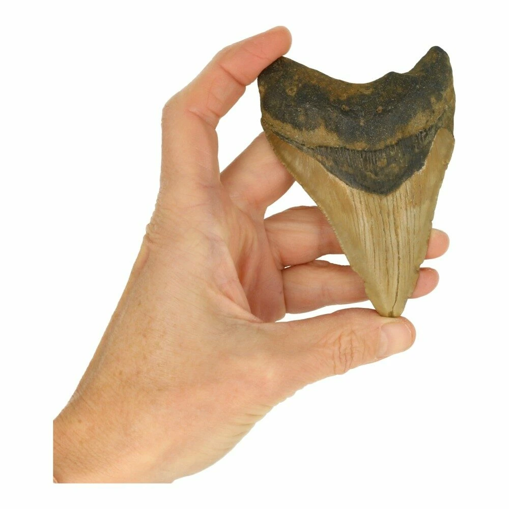 De kleur van een fossiele megalodon tand is afhankelijk van de grond waarin hij miljoenen jaren heeft gerust. Zo kunnen ze variëren van grijs, bruin en zwart tot zandkleurig of blauwgrijs. Elke tand is uniek — gevormd door tijd, water en aarde.