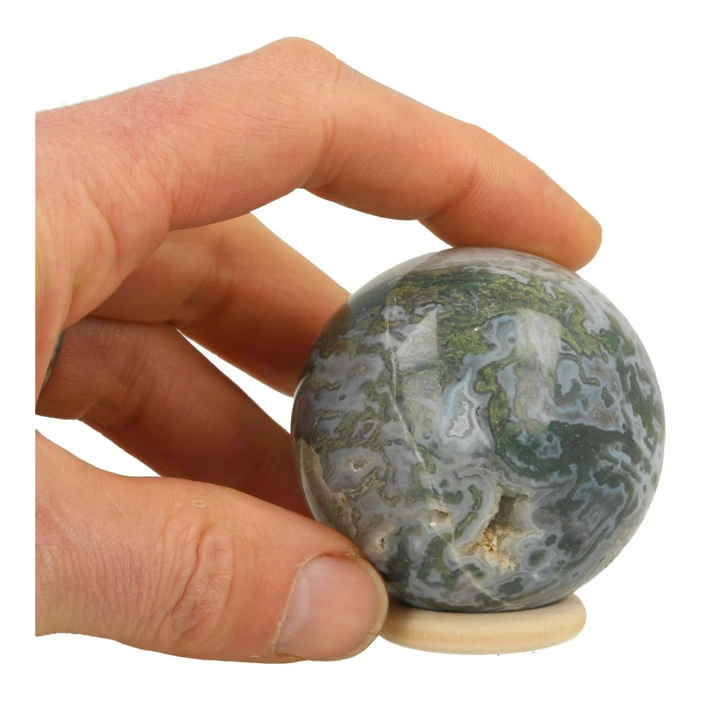 Fraaie mosagaat bol met veel zachte kleuren en een aantal holtes en een diameter van circa 58mm op een houten ringetje. Je ontvangt de mosagaat bol van de foto. Een fraaie bol met rustige energie en fraaie tekening.