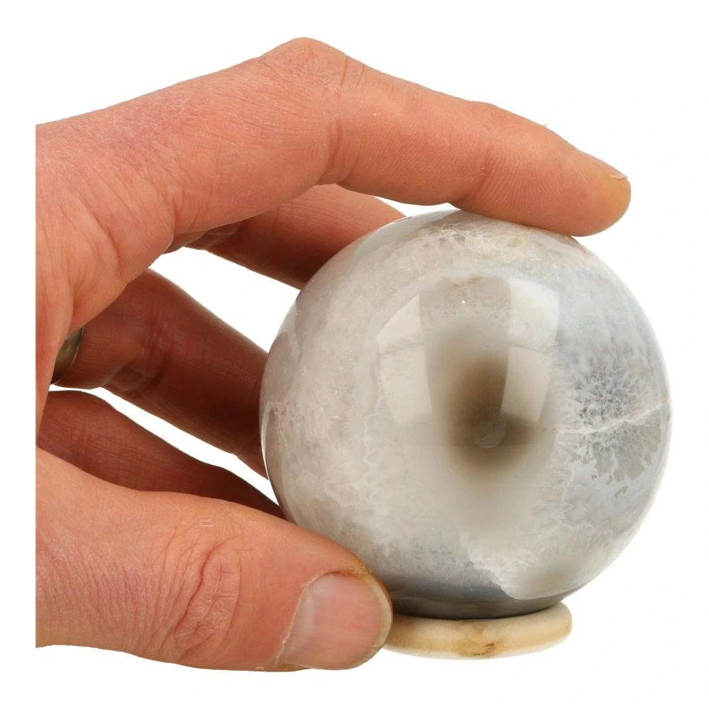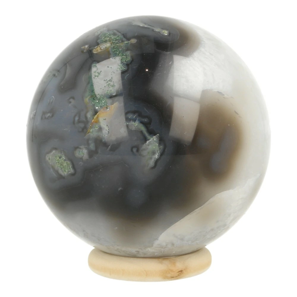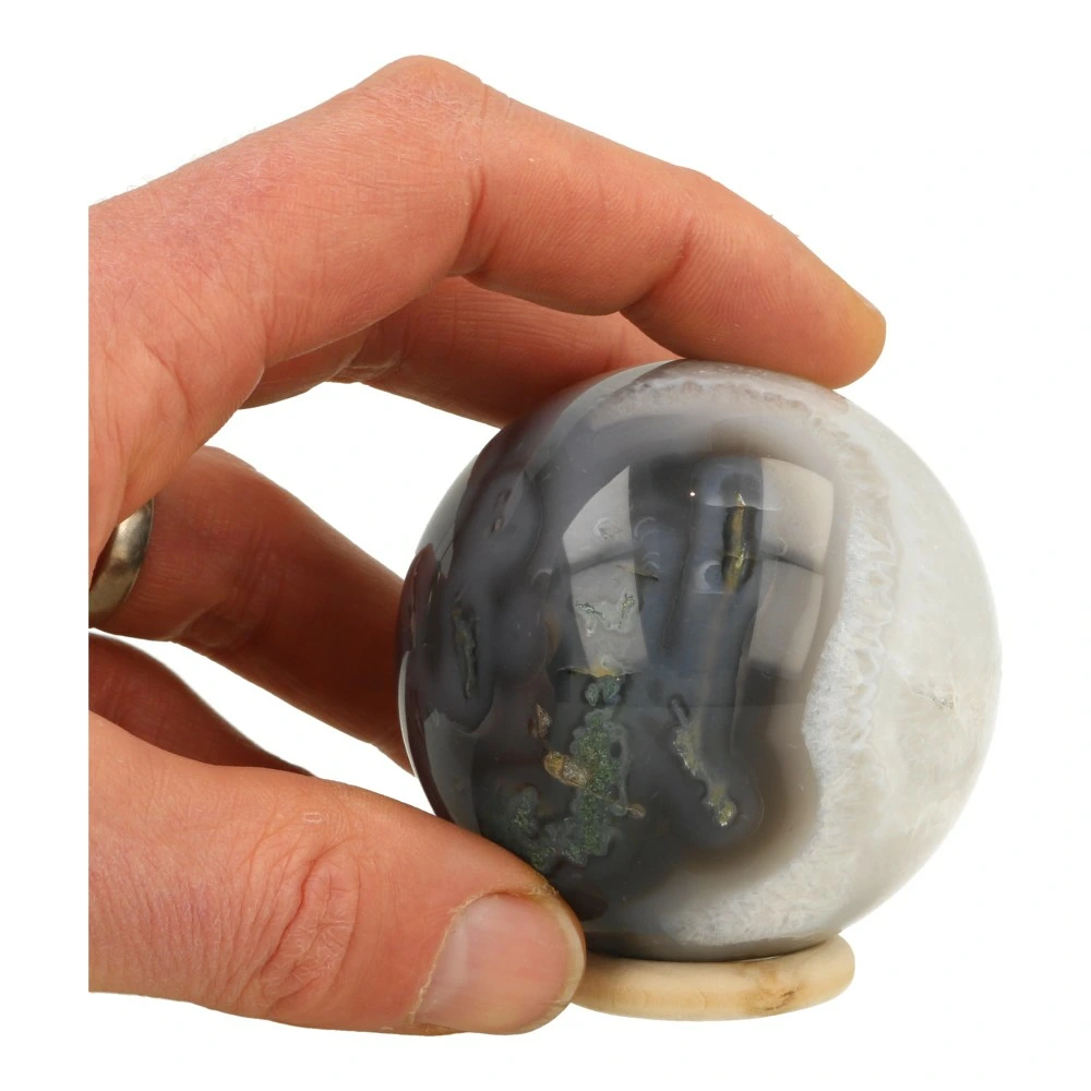 Fraaie mosagaat bol met holtes met bergkristal en een diameter van circa 66mm ‘nr2’ op een houten ringetje. Je ontvangt de mosagaat bol van de foto. Een fraaie bol met heldere energie en bijzondere tekening.