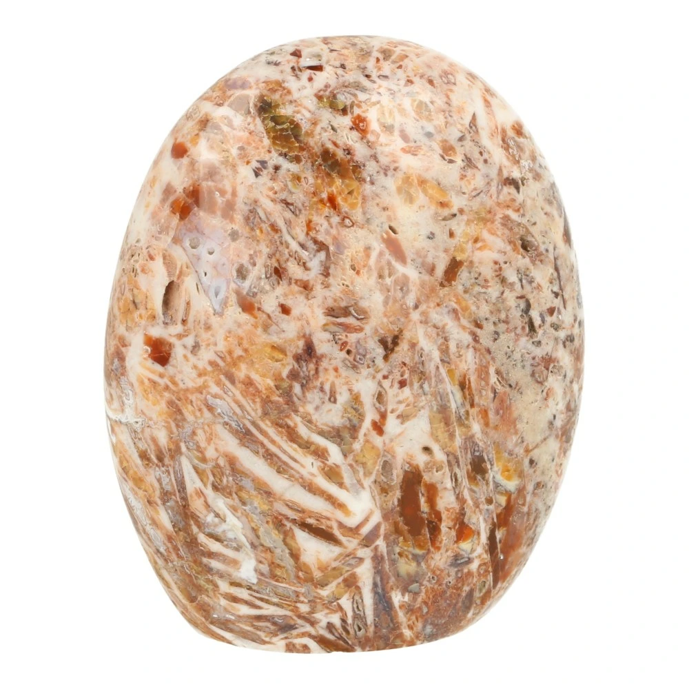 Bijzonder getekende mozaïek kwarts vrije vorm met onder andere agaat, bergkristal en rode opaal met bijzondere tekening. Deze mozaïek kwarts komt uit Madagaskar (Ambatondrazaka) en wordt ook wel cappuccino agaat genoemd. De afmeting van deze mozaïek kwarts vrije vorm is ongeveer 87mm hoog, 70mm breed en 46mm diep. In Madagaskar wordt deze steen rode opaal genoemd. Je ontvangt de mozaïek kwarts vrije vorm van de foto.