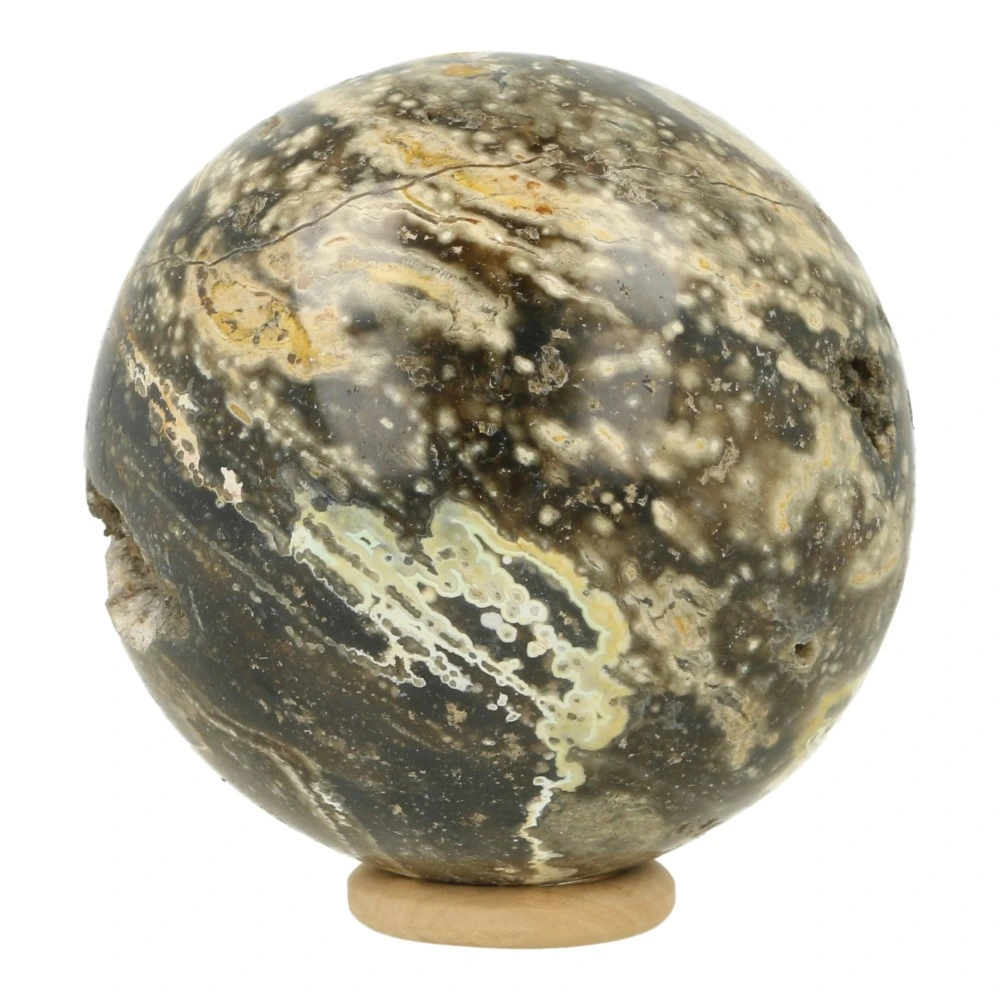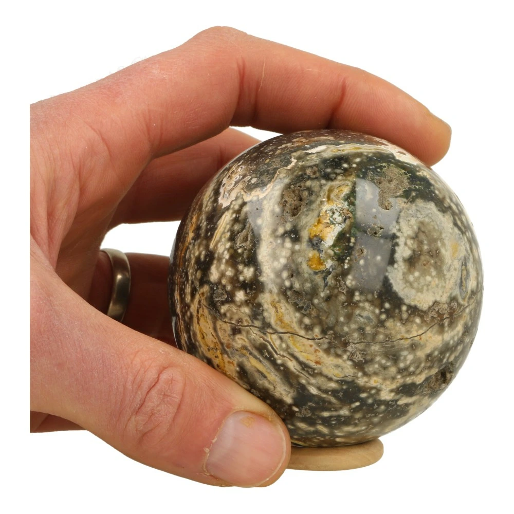 Fijne donker met lichte oceaan jaspis bol met een diameter van 74mm uit Madagaskar. Je ontvangt de oceaan jaspis bol van de foto inclusief houten ringetje. Oceaanjaspis wordt ook wel ogenjaspis genoemd vanwege de stippen.