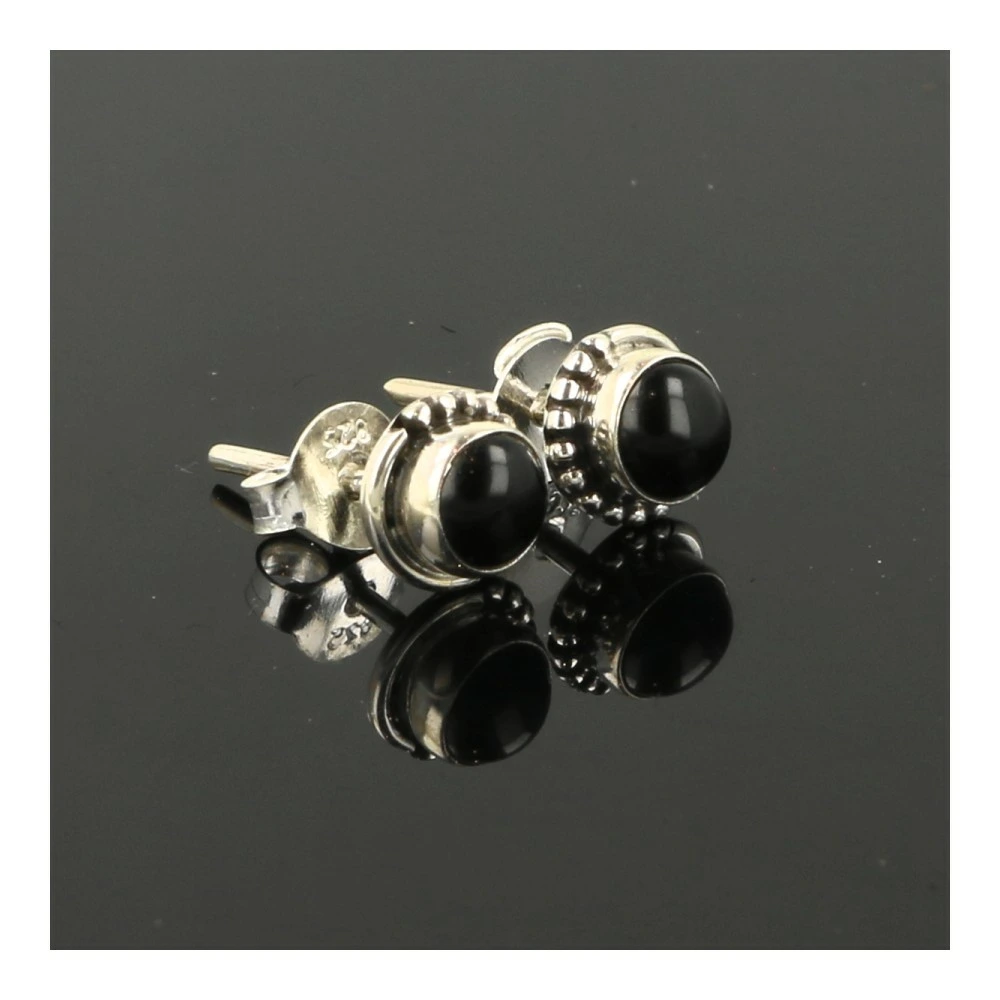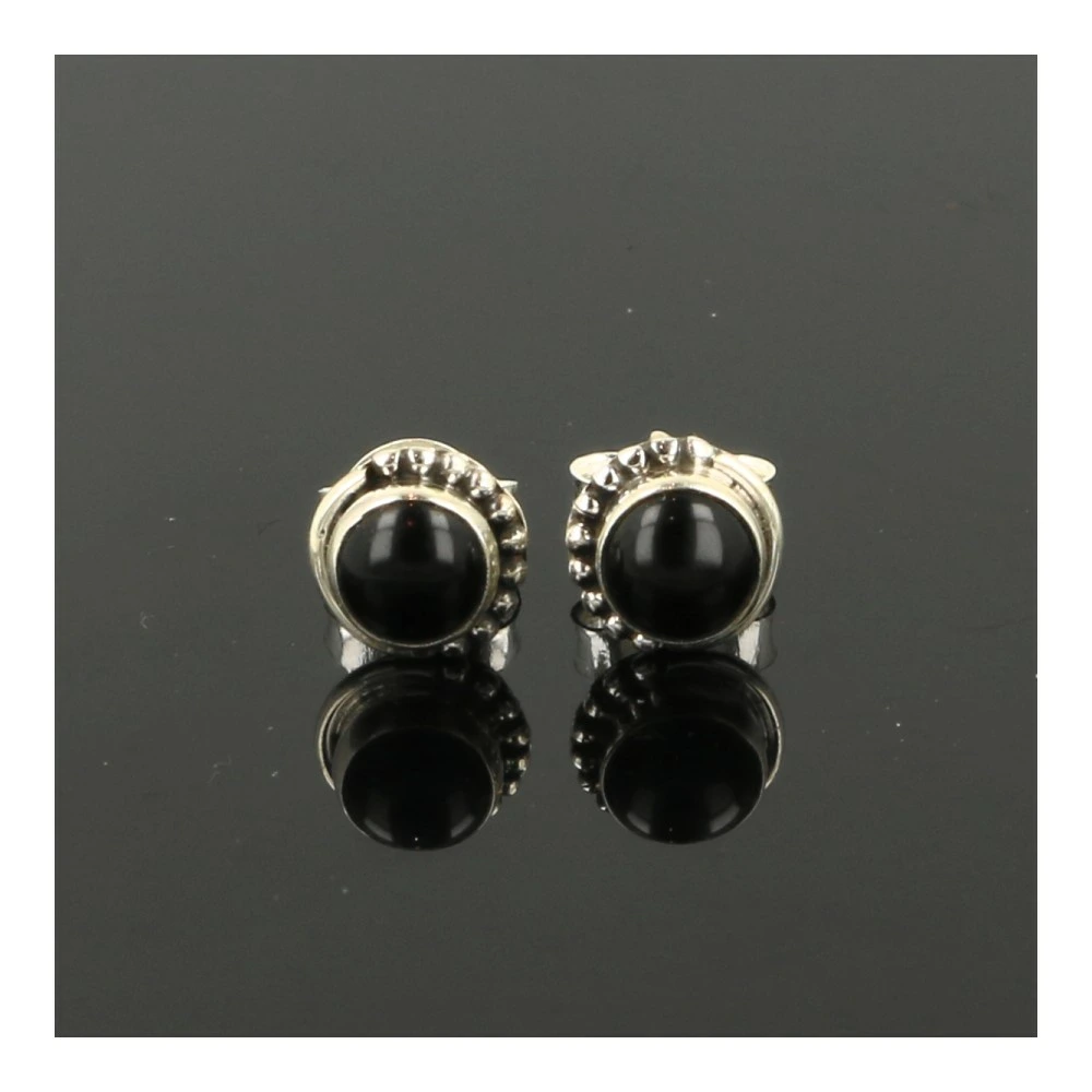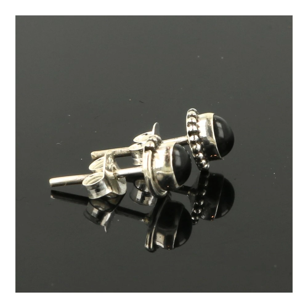 Zwarte onyx oorbel in juwelierskwaliteit 925 sterling zilver. De zwarte onyx heeft een diameter van circa 3mm. De stekertjes zijn ongeveer 10mm lang en centraal achter de oorbel geplaatst. De rand van zilver heeft een a-symmetrisch werkje.