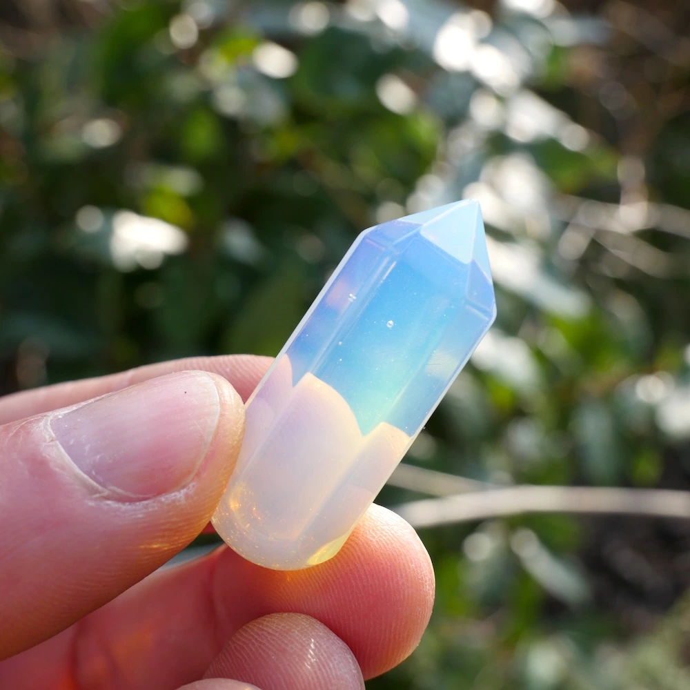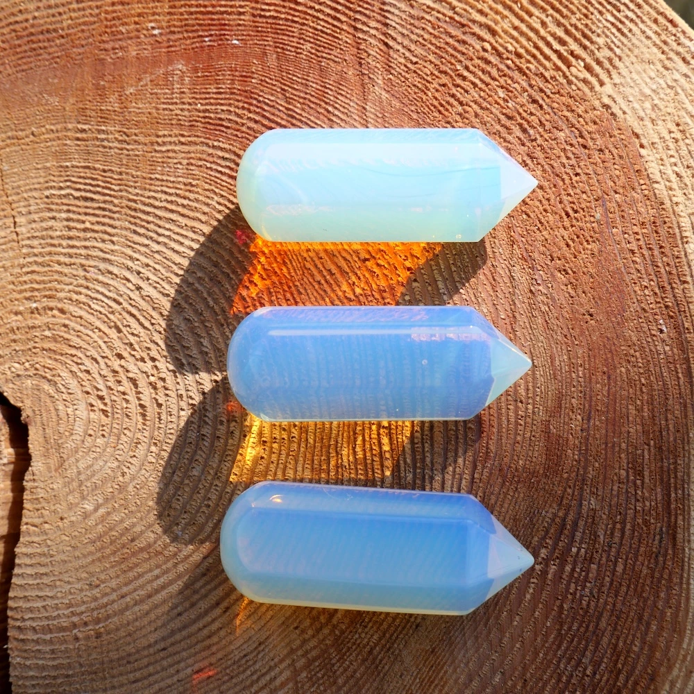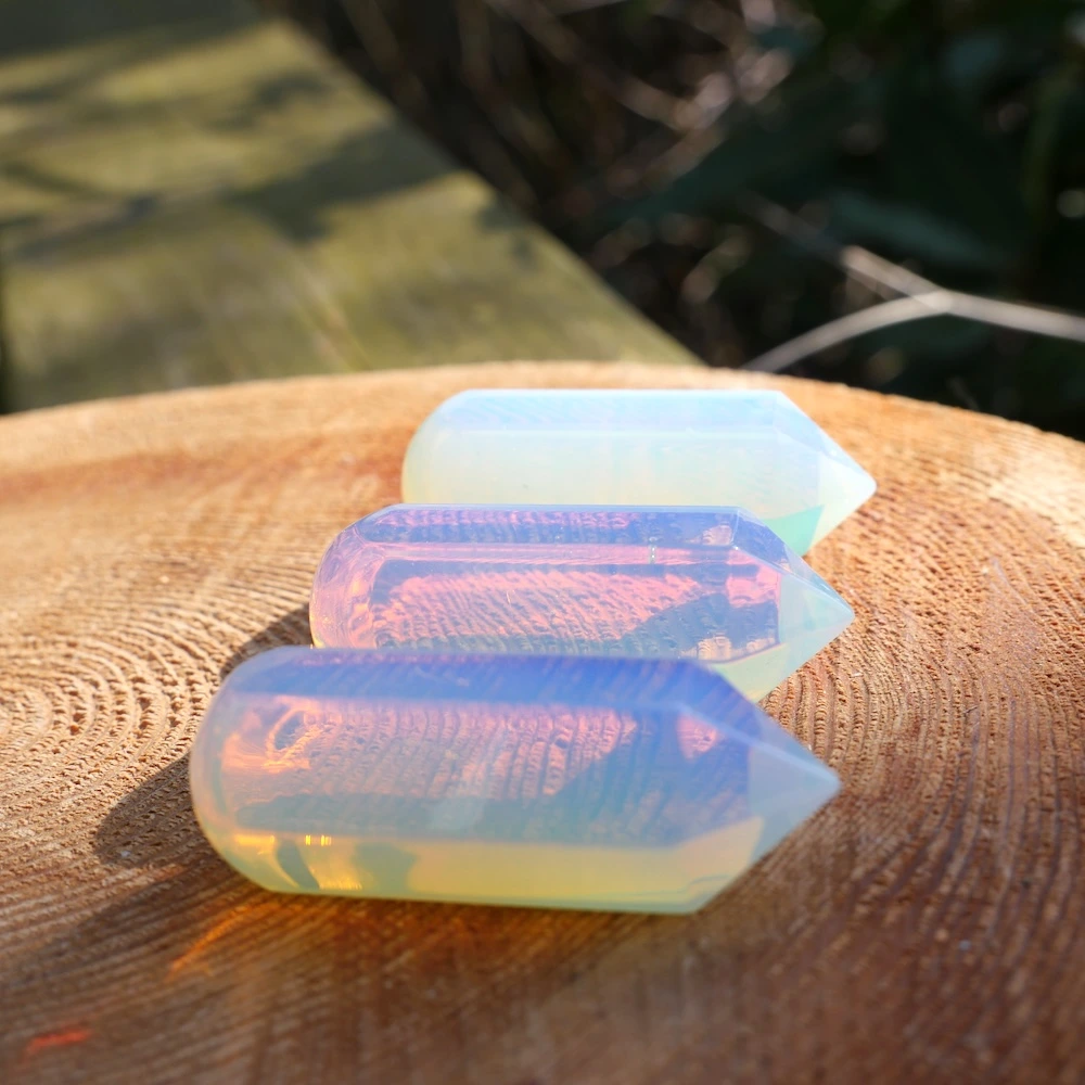 Opaliet massagesteen van circa 5cm lang en 2cm hoog en diep. Deze zeshoekige massagestaaf heeft een bolle onderkant en spitse punt, zodat je zowel de spieren kunt masseren als meridiaanpunten kunt stimuleren. Je ontvangt een soortgelijke opaliet massagestaaf als op de foto. Opaliet is fraai, door mensen gemaakt glas en geen natuurlijke edelsteen.