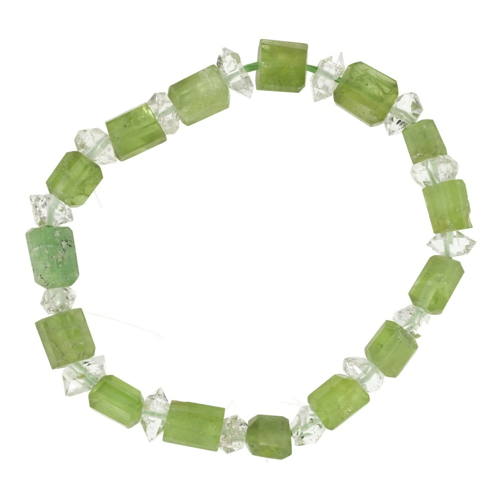 Prachtige heldergroene peridoot armband gecombineerd met stralende Pakistaanse ‘Herkimer diamonds’ op rekbaar koord (nr.1). De peridoot stukjes zijn stuk voor stuk gepolijst en hebben een frisse, levendige uitstraling, terwijl de natuurlijke ‘Herkimer diamonds’ zorgen voor extra schittering en helderheid.