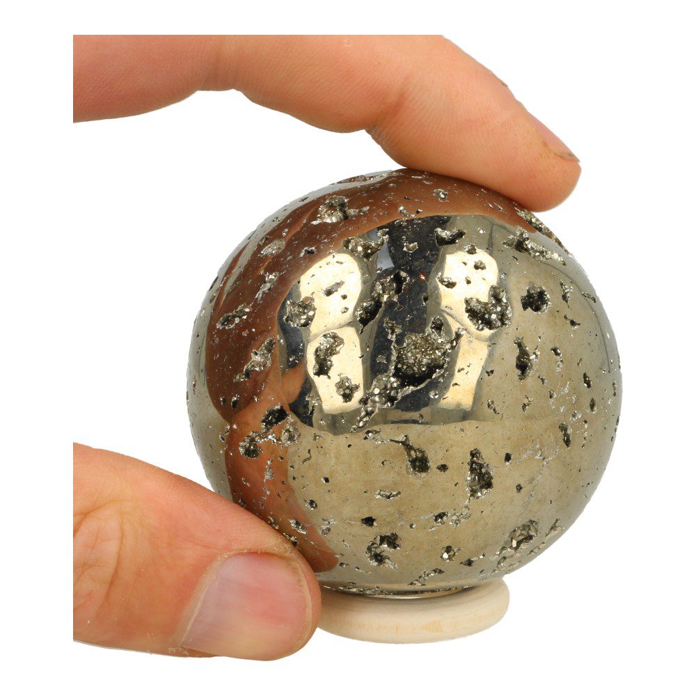 Mooi formaat pyriet bol met een diameter van 58mm. Deze pyriet bol heeft een mooie glans en een aantal holtes waarin de pyriet kristallen goed zijn te zien. Een schoonheid voor in iedere ruimte. Je ontvangt de bol van de foto met houten ringetje.