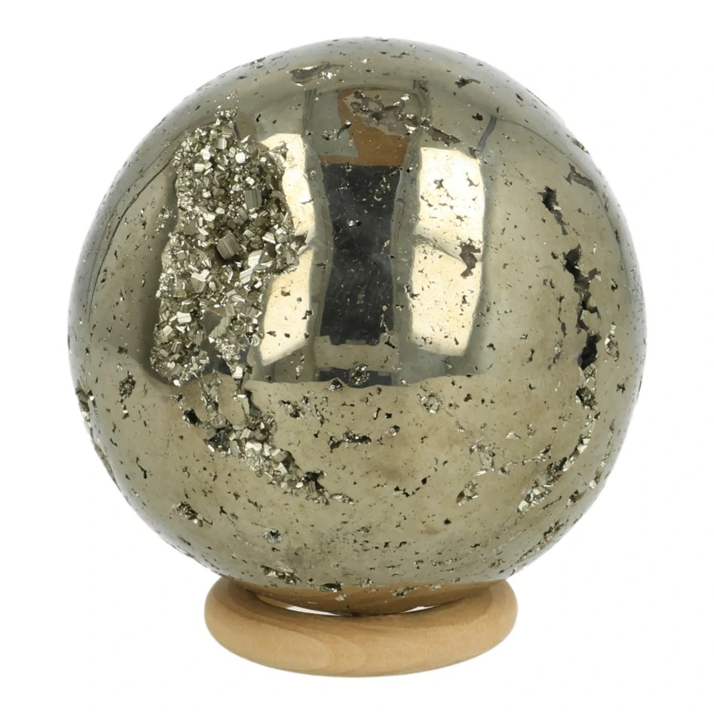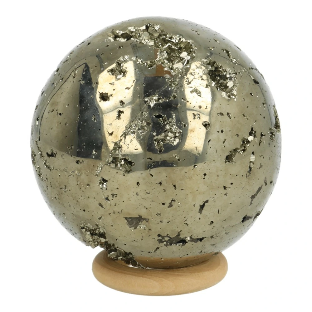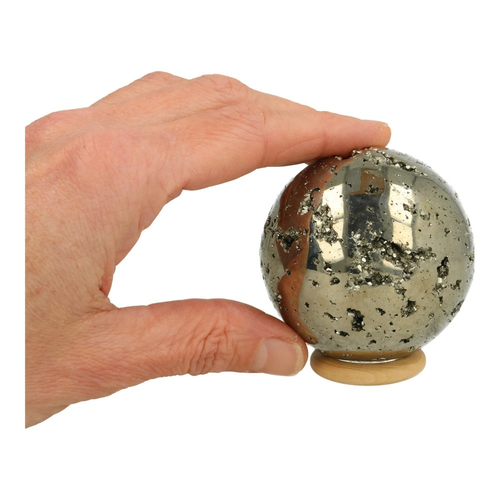Mooi formaat pyriet bol met een diameter van 61mm uit Peru. Deze pyriet bol heeft een mooie glans en een aantal holtes waarin de pyriet kristallen goed zijn te zien. Een schoonheid voor in iedere ruimte. Je ontvangt de bol van de foto met houten ringetje.