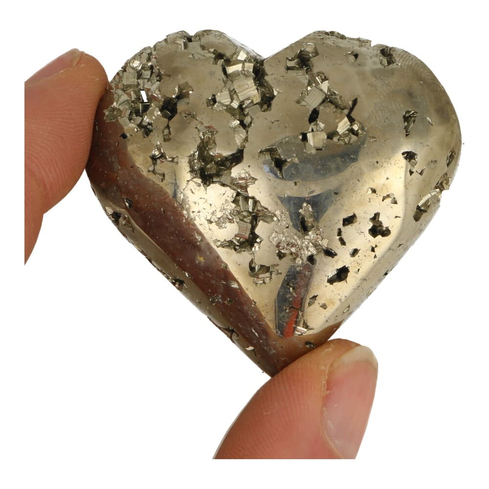 Mooi formaat pyriet hart uit Peru. De afmeting van dit pyriet hart is 57mm breed, 53mm hoog en 24mm dik. Dit pyriet hart heeft een fraaie glans en holtes met pyriet kristallen. Je ontvangt het hart van de foto.