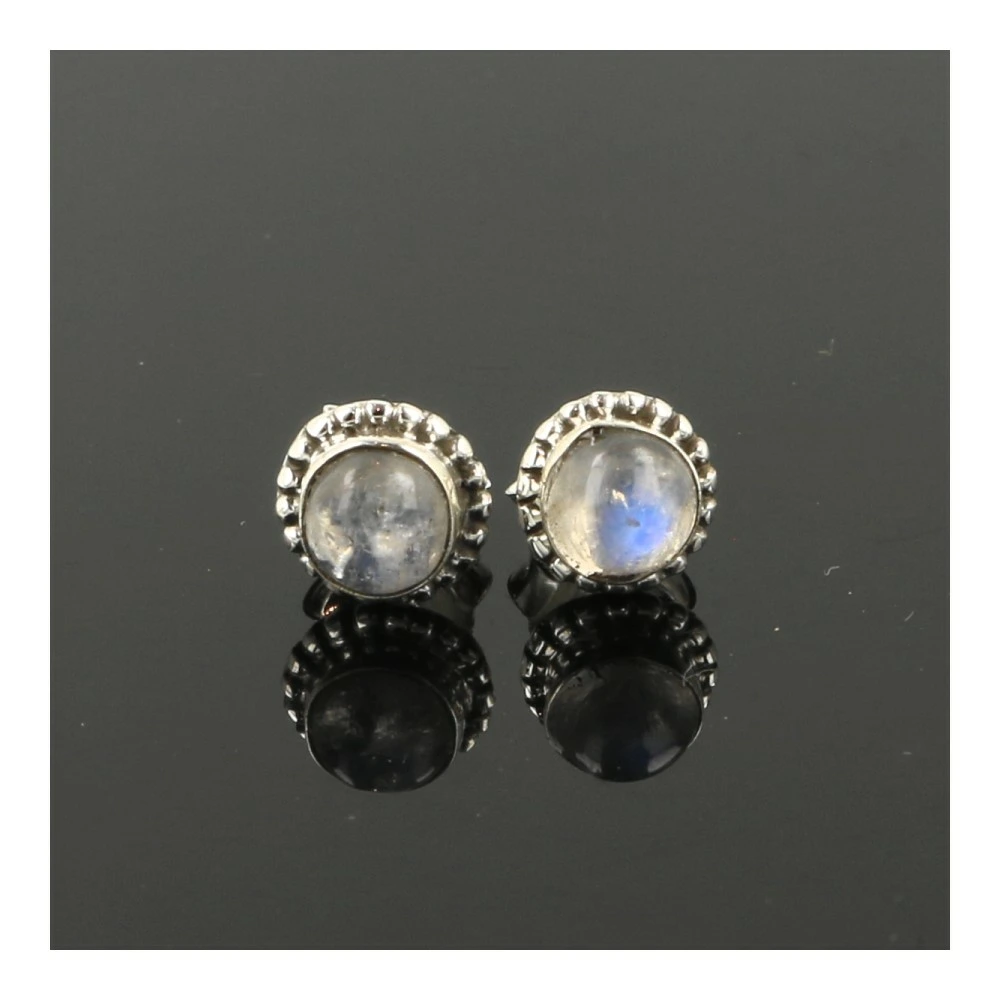 Mooie regenboog maansteen oorbel in zilver met een fraai glanzende regenboog maansteen van 4mm, met sierlijke rand. Onder de juiste hoek heeft iedere oorbel de kenmerkende blauwe gloed van witte maansteen. Deze fraaie oorbel is licht doorschijnend en de blauwe flash is duidelijk aanwezig. Je ontvangt een soortgelijke set regenboog maansteen oorbellen als op de foto.