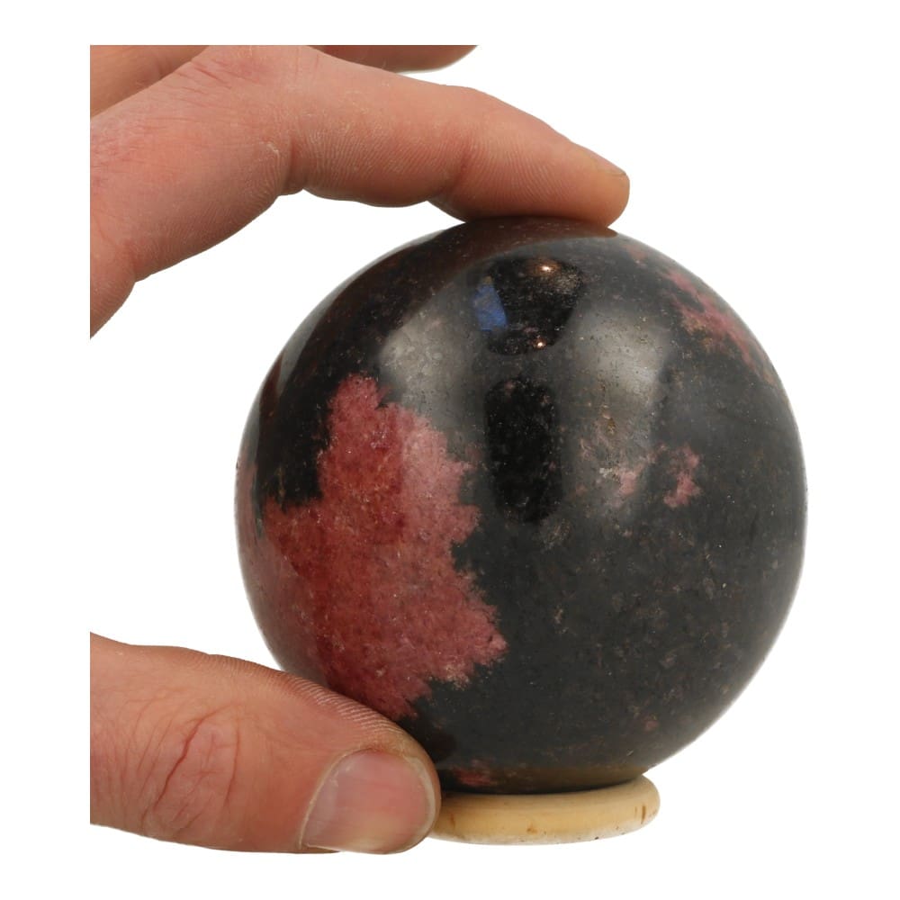 Mooie zwart-roze rhodoniet bol met een diameter van 81mm uit Madagaskar. Je ontvangt deze rhodoniet bol met een ringetje.