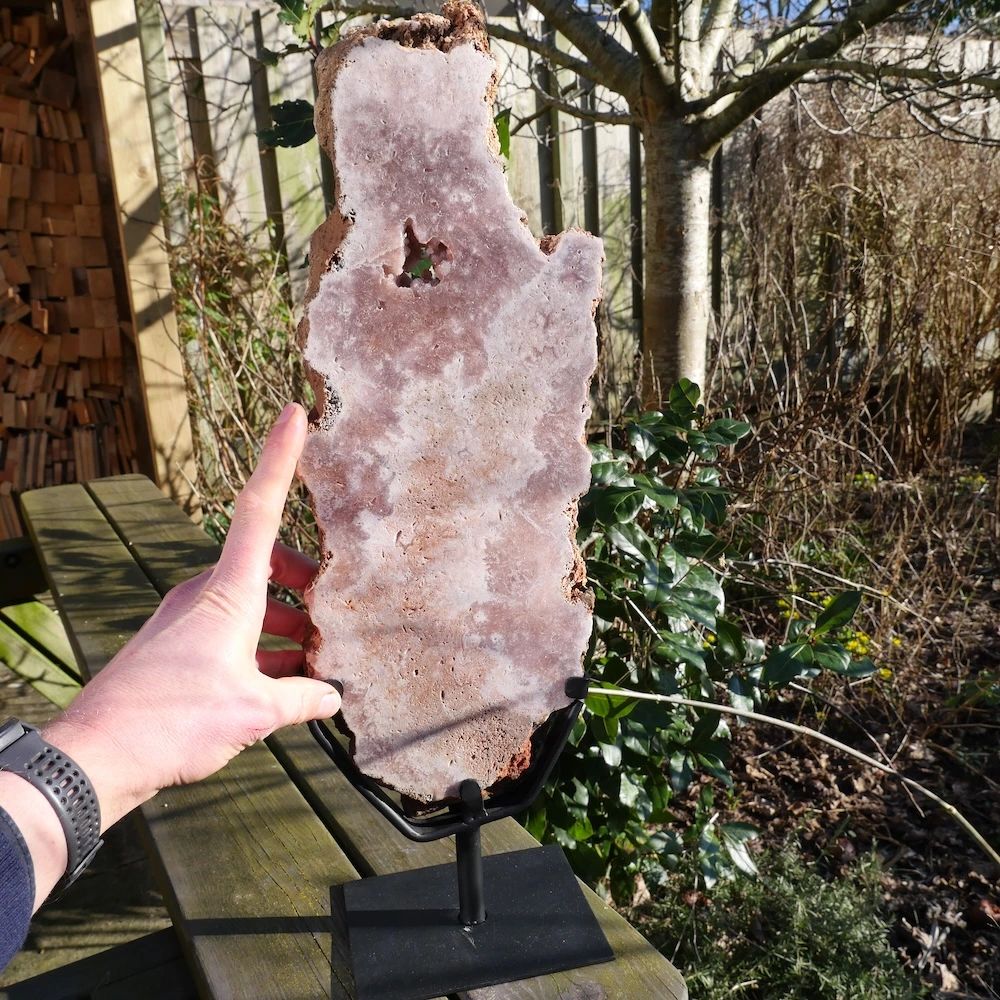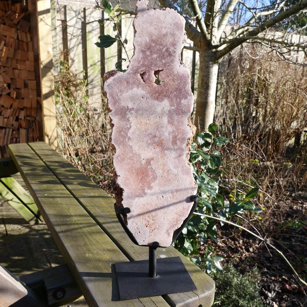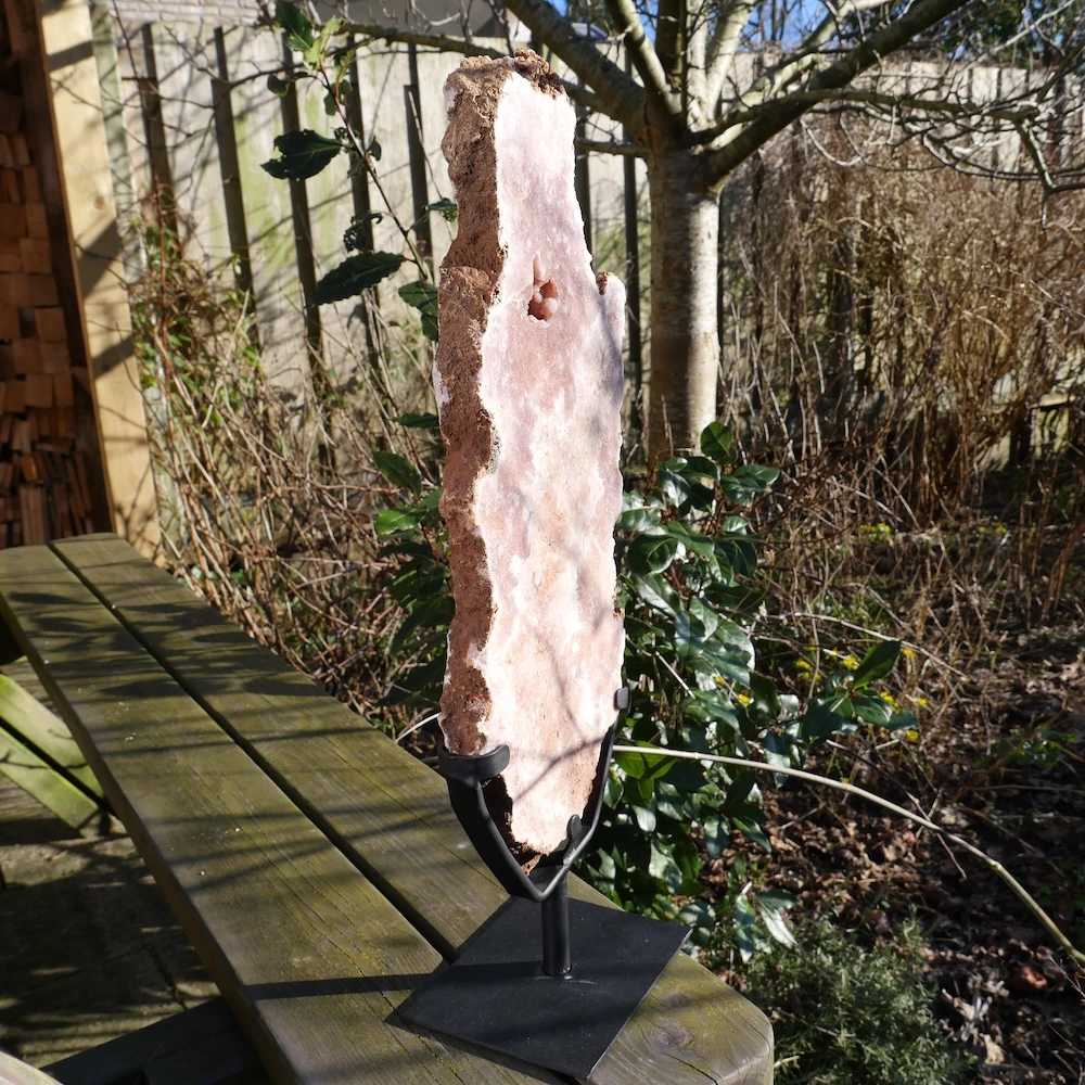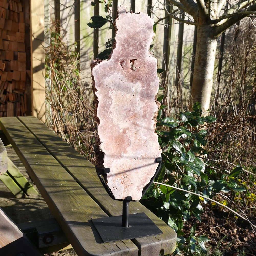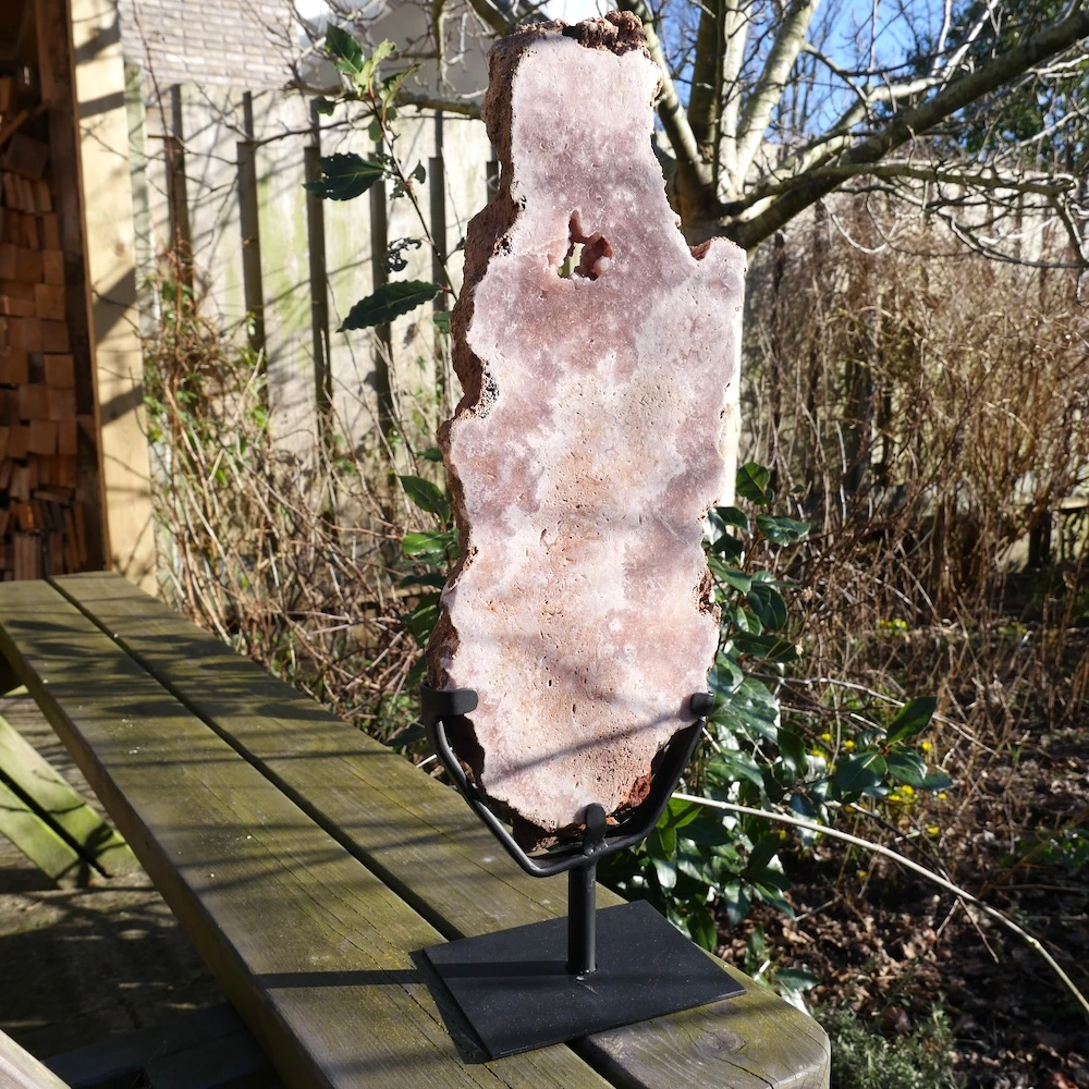 Fraaie schijf van roze amethist op metalen standaard. Beide zijdes van de roze amethist op standaard zijn fraai gepolijst en hebben een net een andere tekening met holtes met mooi glimmende kristallen. De afmeting van deze roze amethist op standaard is ongeveer 52,5cm hoog (inclusief voet), 16cm breed en 2,5cm dik. De voet heeft een afmeting van 12x15cm. Deze roze amethist bevat natuurlijke holte’s met kristallen. De vindplaats is Brazilië. Dit is feitelijk een roze chalecoonvariant. Je ontvangt de roze amethist op standaard van de foto.