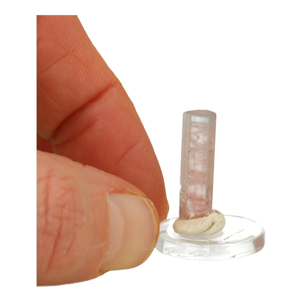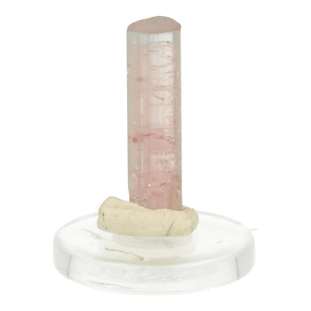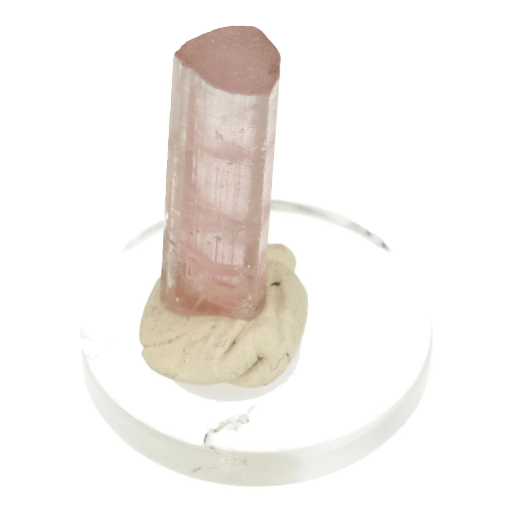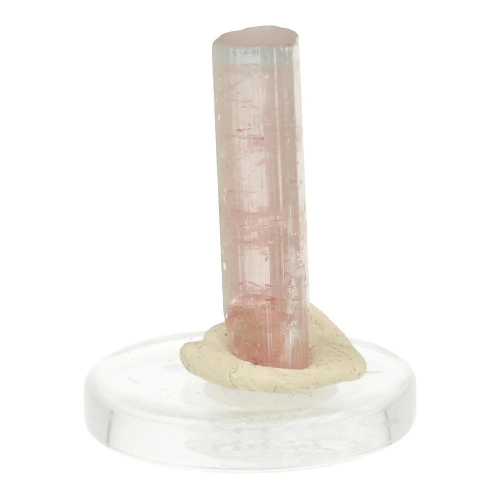 Unieke roze met heldere en lichtblauwe toermalijn kristal op rond doorzichtig voetje ‘nr1’. Een prachtig heldere kristal met zachte en heldere energie. De afmeting van het kristal is ongeveer 21mm hoog en 5mm breed met de karakteristieke kristaldoorsnede van toermalijn. De top is lichtblauw (blue cap toermalijn). Dit roze met blauwe toermalijn kristal komt uit Afghanistan. Uniek en ongeslepen!