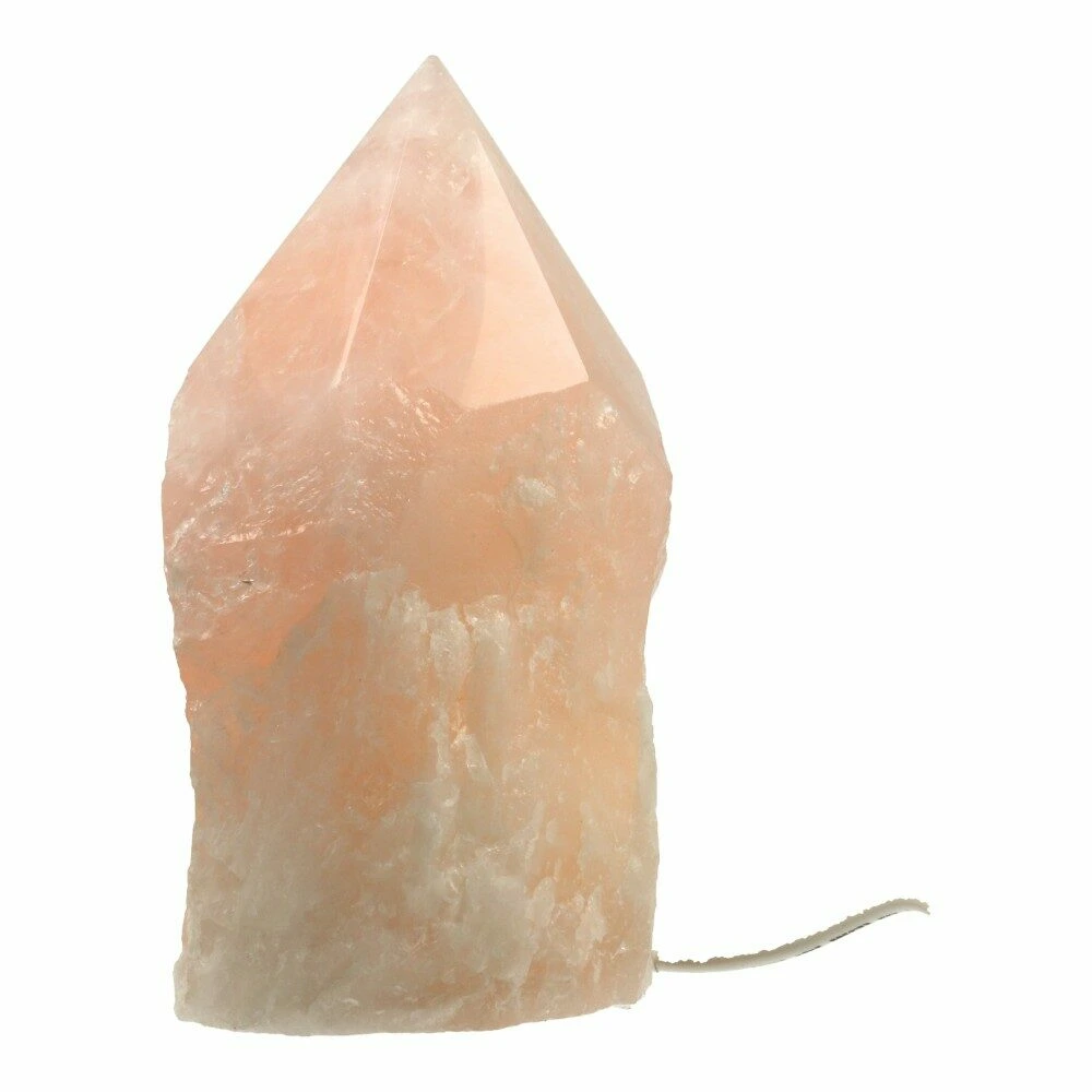 Mooie rozenkwarts lamp punt met een afmeting van circa 18cm hoog, 10cm breed en 9cm diep. Deze ruwe rozenkwarts van mooie roze kwaliteit is in een punt geslepen. Je ontvangt de rozenkwarts lamp punt van op de foto. De lichtbron is een led lampje aan een wit snoer met stekker en schakelaar.