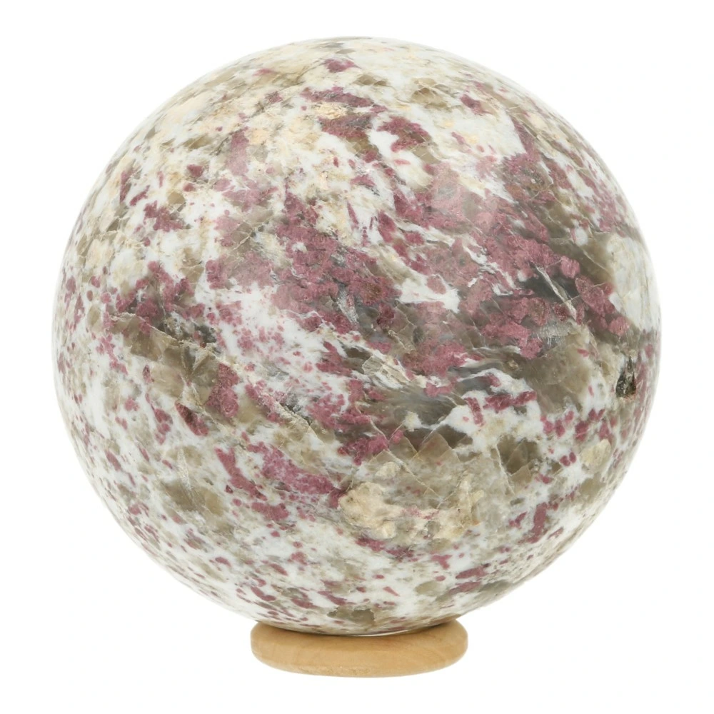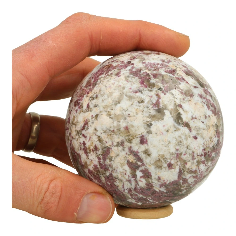 Mooi formaat rubelliet bol van circa 80mm diameter. Deze rubelliet bol is ideaal om in een ruimte neer te zetten. Deze mooie bol heeft een fijne verdeling van helder paarse toermalijn stukjes in mooi kwarts. Je ontvangt de rubelliet bol van de foto, inclusief houten ring.