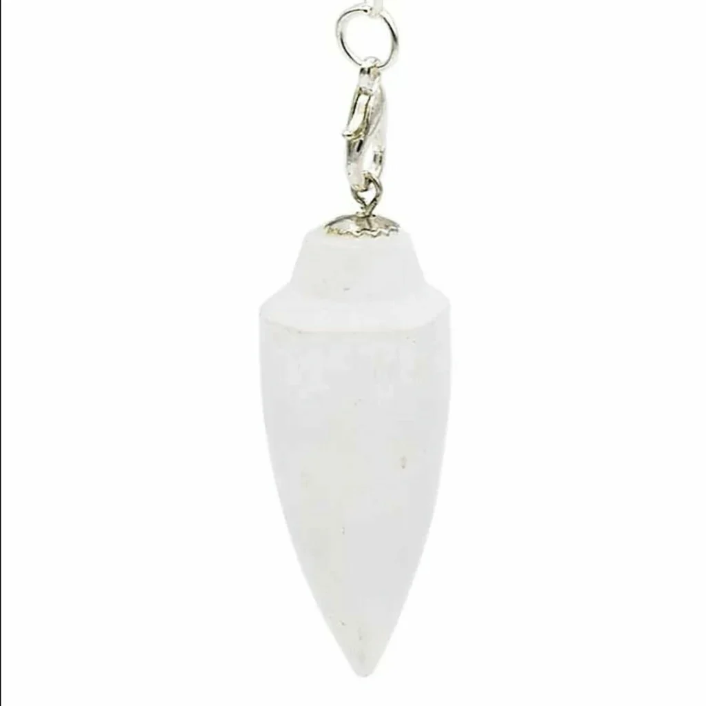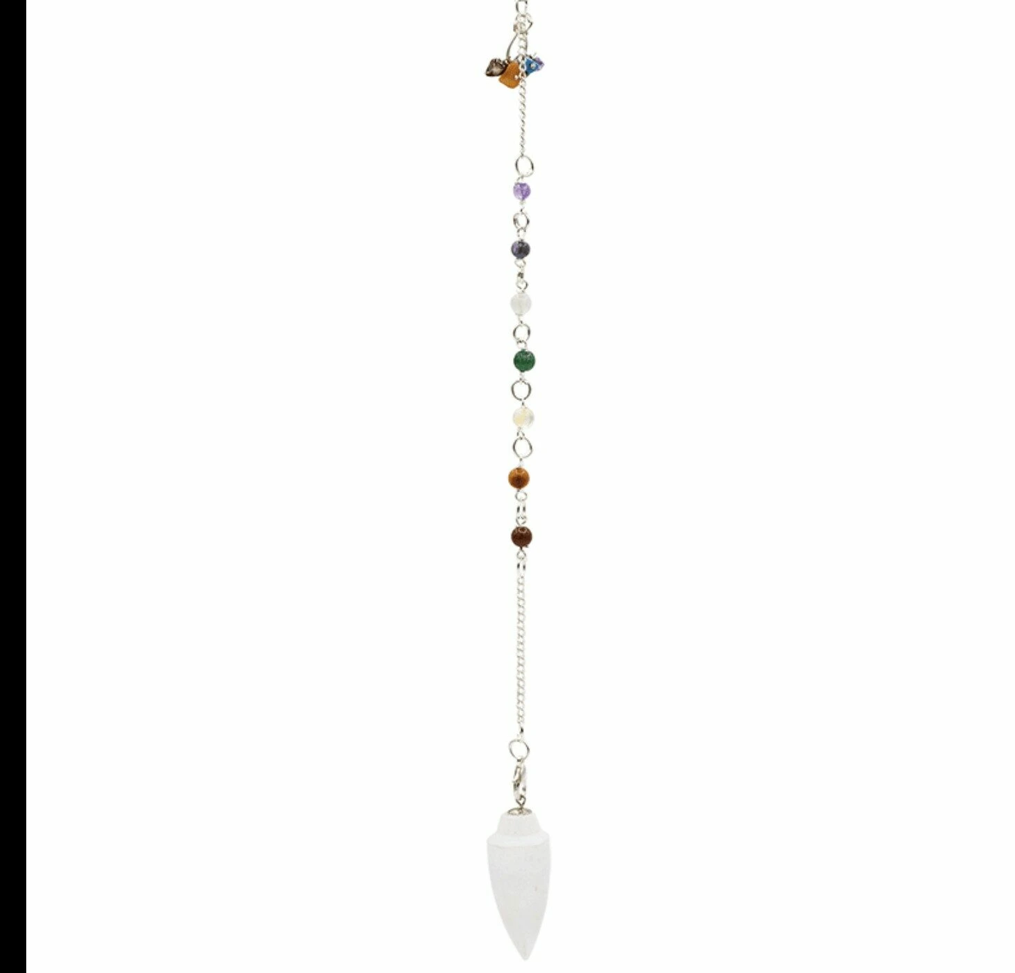 Fijne seleniet pendel (satijnspaat) met chakra ketting. De afmetingen van deze seleniet pendel zijn ongeveer 4 cm hoog en 1,5 cm breed. Iedere seleniet pendel is uniek en kan iets afwijken van maat en uiterlijk. Afhankelijk van het invallende licht kan de kleur meer wit ogen. Seleniet kan beter niet te veel met water in contact komen.