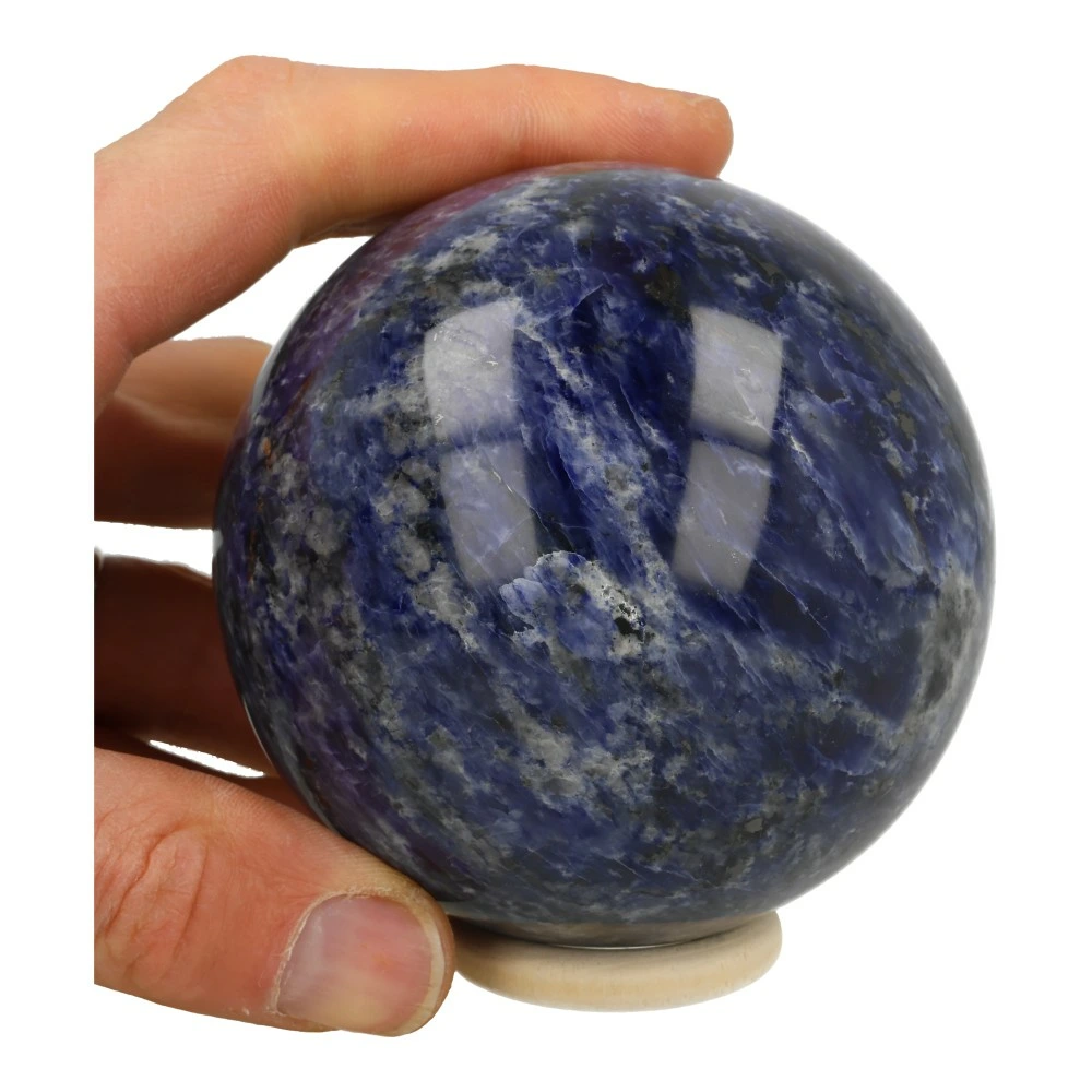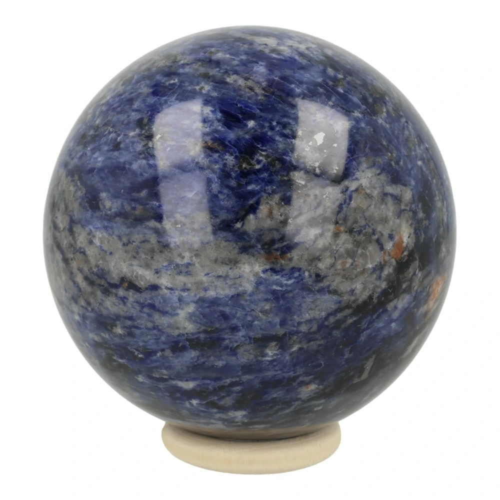 Zeer fraaie sodaliet bol met de karakteristieke diep-blauwe kleur en witte calciet aders uit Kunene River, Namibië. De diamater van deze sodaliet bol is circa 90mm. Je ontvangt de sodaliet bol van de foto inclusief houten ring.