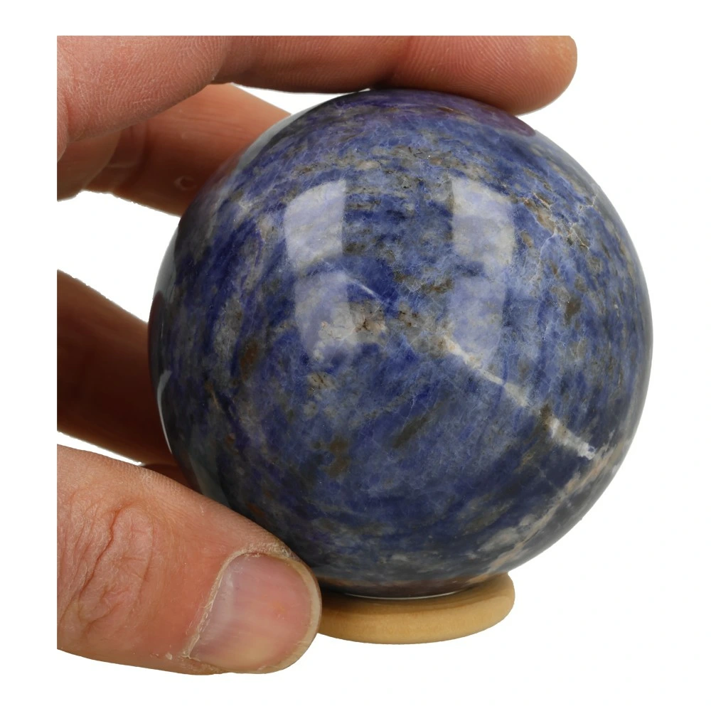 Mooi formaat sodaliet bol met de karakteristieke diep-blauwe kleur en aders uit Kunene River, Namibië. De diameter van de bol is ongeveer 70mm. Je ontvangt de bol van de foto inclusief een houten ring.