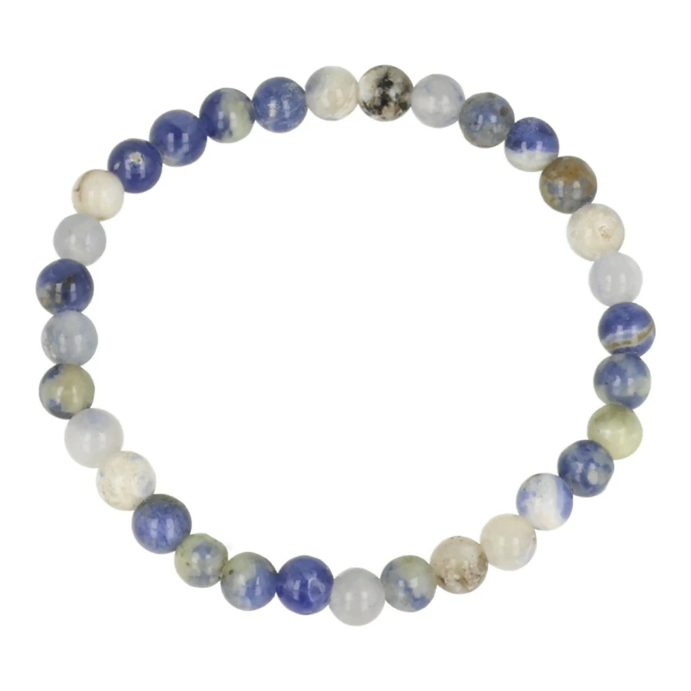Fijne sodaliet kinderarmband met kralen van 4mm en de karakteristieke blauwe kleur en witte aders. Deze sodaliet bevat iets meer wit dan blauw. Deze armband is op rekbaar koord geregen en past bij een polsomtrek van ongeveer 11,5-12,5cm. Je ontvangt een soortgelijke sodaliet kinderarmband 4mm als op de foto.