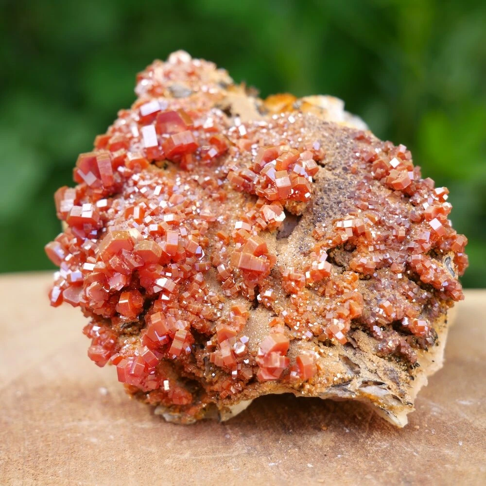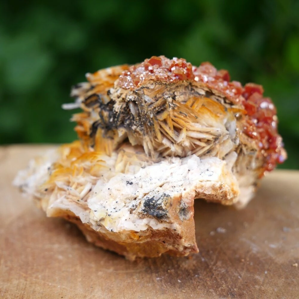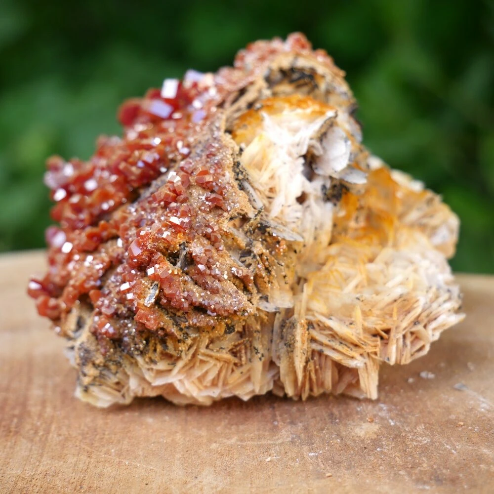 Mooi stuk met fraaie vanadiniet kristallen op roze bariet uit Marokko. De afmeting van dit stuk vanadiniet ruw is ongeveer 9 x 8 x 5 cm. Aantrekkelijk aan dit stuk is dat het rondom vol zit met kristallen en een bijzondere vorm met veel kleuren bariet heeft. Je ontvangt het stuk van de foto.