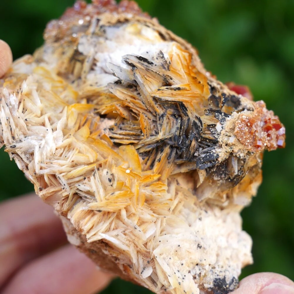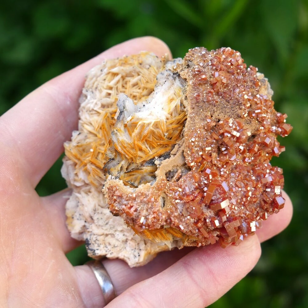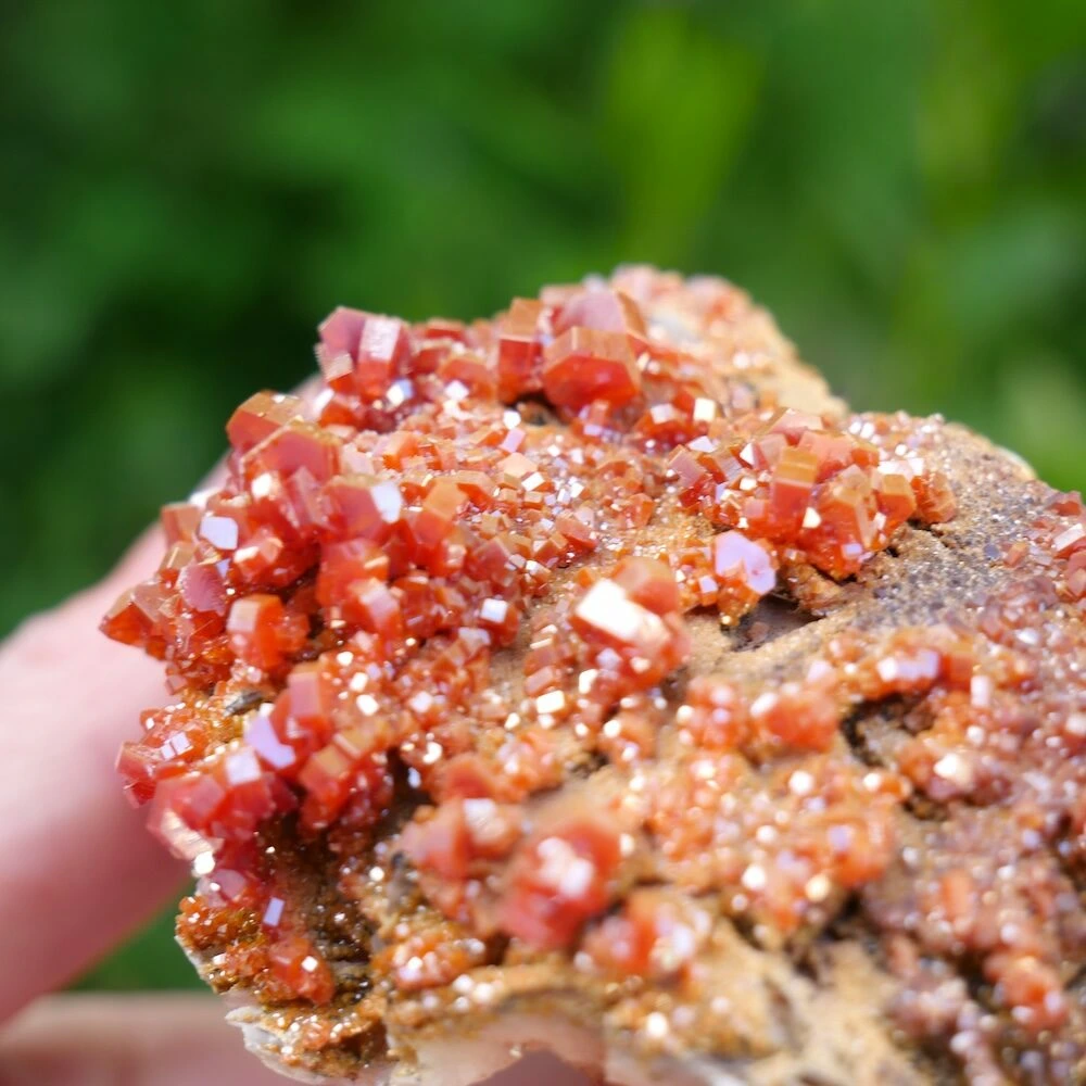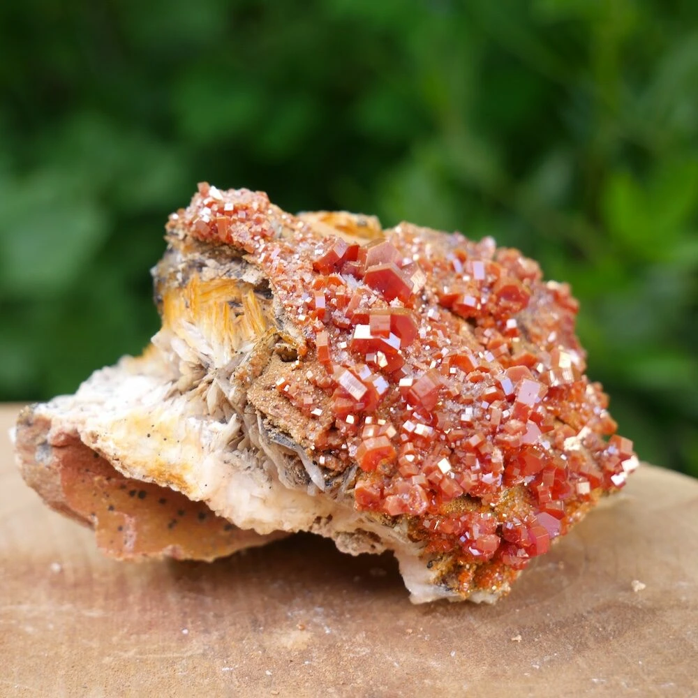Mooi stuk met fraaie vanadiniet kristallen op roze bariet uit Marokko. De afmeting van dit stuk vanadiniet ruw is ongeveer 9 x 8 x 5 cm. Aantrekkelijk aan dit stuk is dat het rondom vol zit met kristallen en een bijzondere vorm met veel kleuren bariet heeft. Je ontvangt het stuk van de foto.