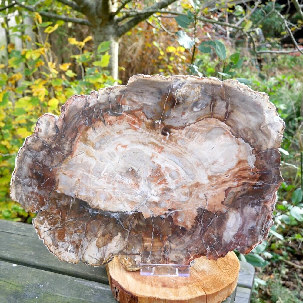Fraaie versteend hout schijf groot met een afmeting van 42cm lang, 29cm hoog en 2cm dik uit Madagaskar. Echt een uniek stuk met hele mooie kleuren, inclusief standaard zodat je deze rechtop kunt neerzetten. De schijf is aan beide zijden fraai gepolijst, dus je kunt kiezen welke kant je aan de voorzijde neerzet.