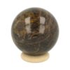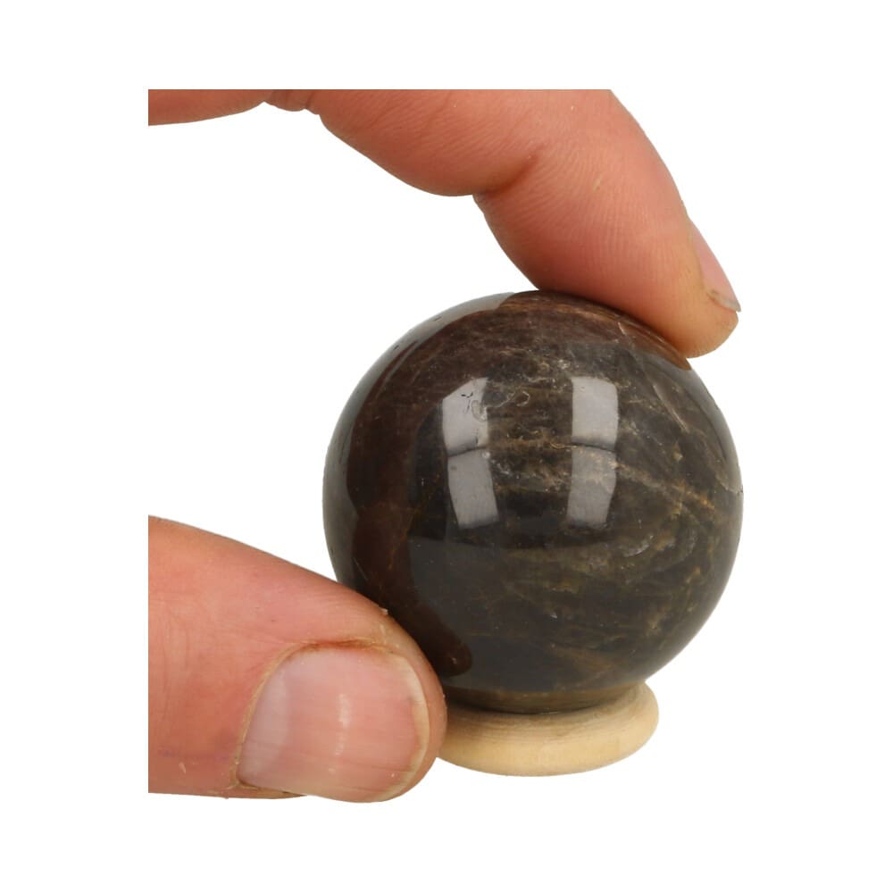 Zwarte maansteen bol van ca 4cm doorsnede. De kleurstelling varieert van heel donker naar grijs en bruin-tinten. Je ontvangt een soortgelijke zwarte maansteen bol als op de foto, inclusief houten ringetje. De kwaliteit en kleur is zeer gelijkwaardig.